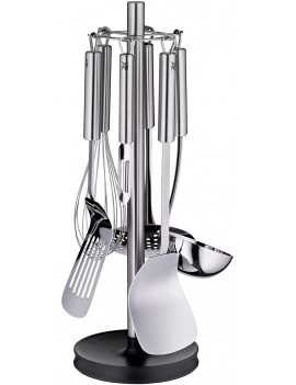 Obsah: 1x stojan na náčiní (výška 42,5 x 14,5 cm), 1x naběračka 30 cm, 1x skimmer 30 cm, 1x lopatka 36,2 cm, 1x obracečka 32,2 cm, 1x šlehací metla 25 cm, 1x škrabka na zeleninu 19 cm. Materiál: Nerezová ocel Cromargan 18/10 částečně matná. Nerezový, vhodný do myčky, rozměrově stálý, hygienický, odolný proti kyselinám a nezničitelný. Vysoce kvalitní silikon. Kuchyňské pomůcky lze díky stojánku skladovat prostorově úsporně a jsou vždy po ruce Funkční části jsou pevně zabetonovány v rukojeti. S praktickým očkem pro uložení na věšák s háčkem Design: WMF Atelier
